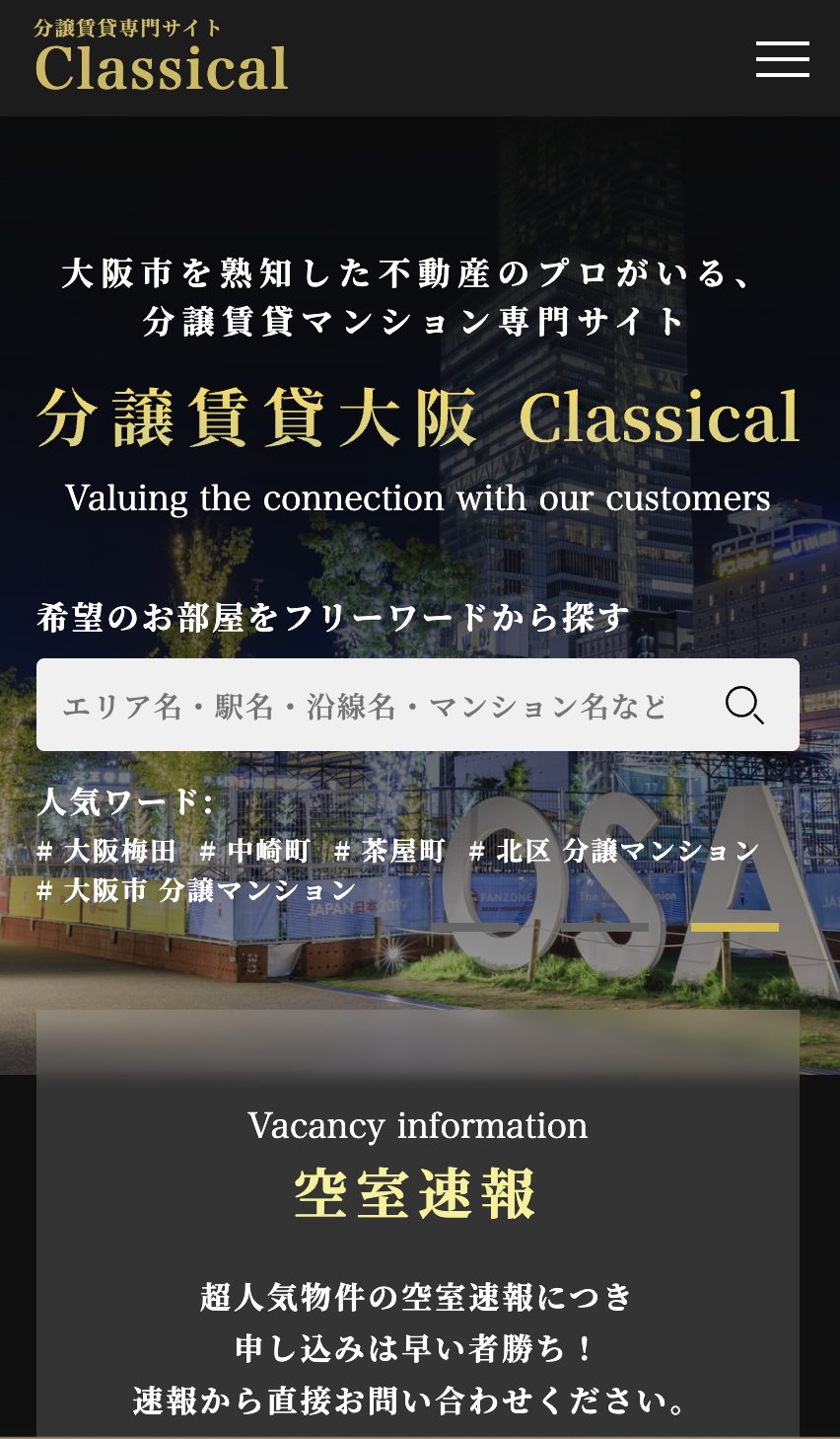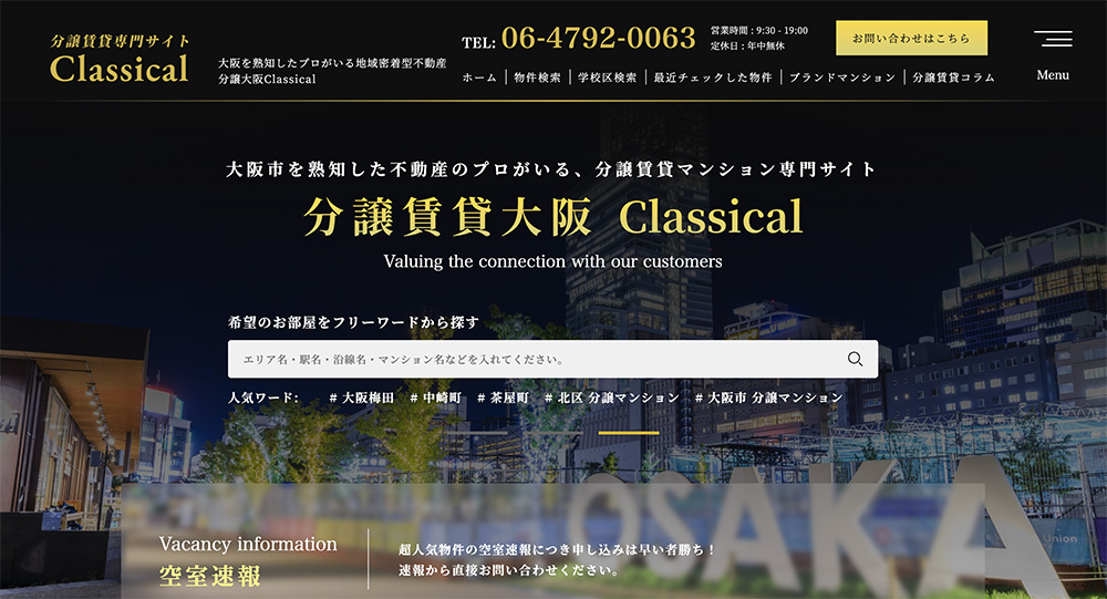 株式会社クランホーム様による分譲賃貸マンション専門サイト”分譲大阪Classical”です。